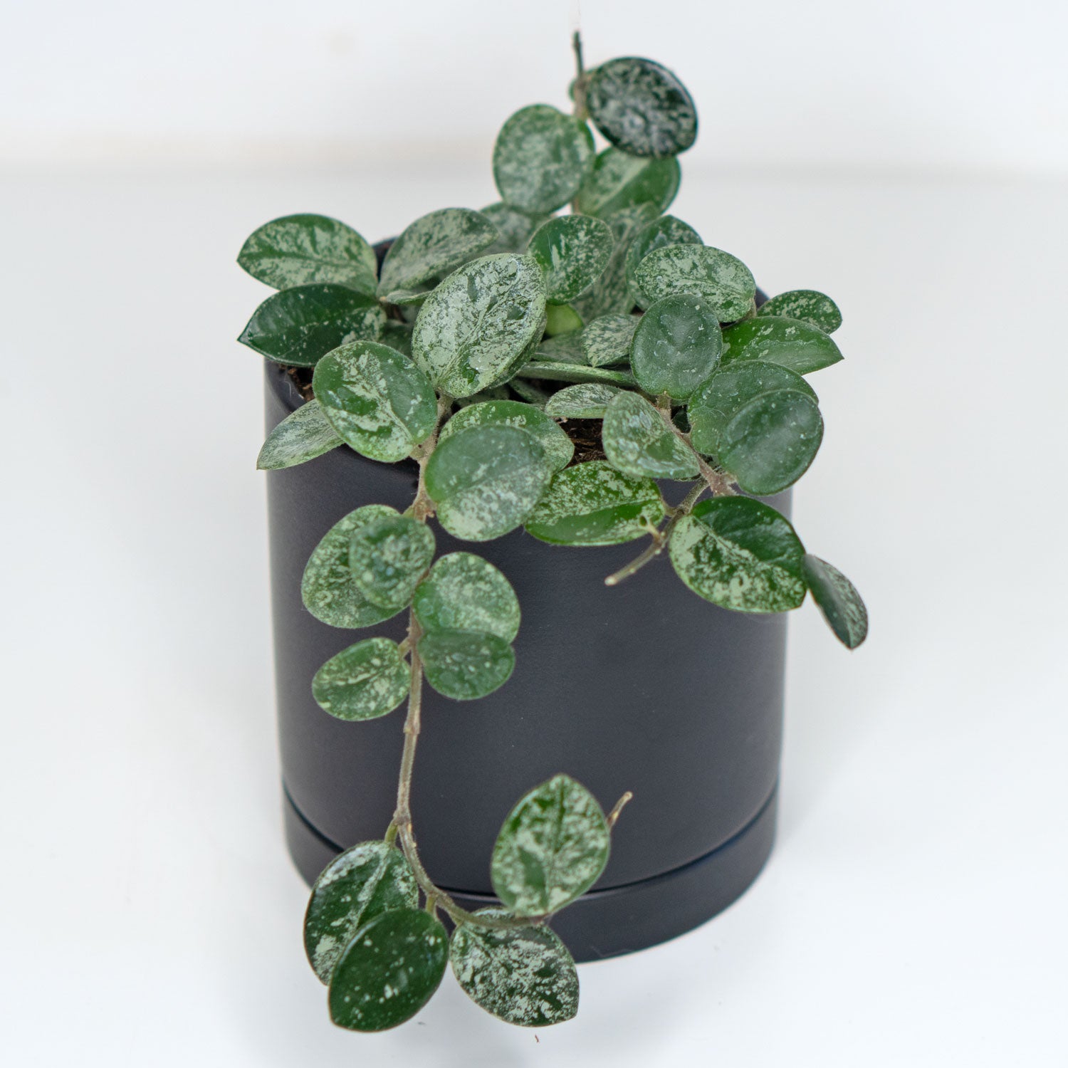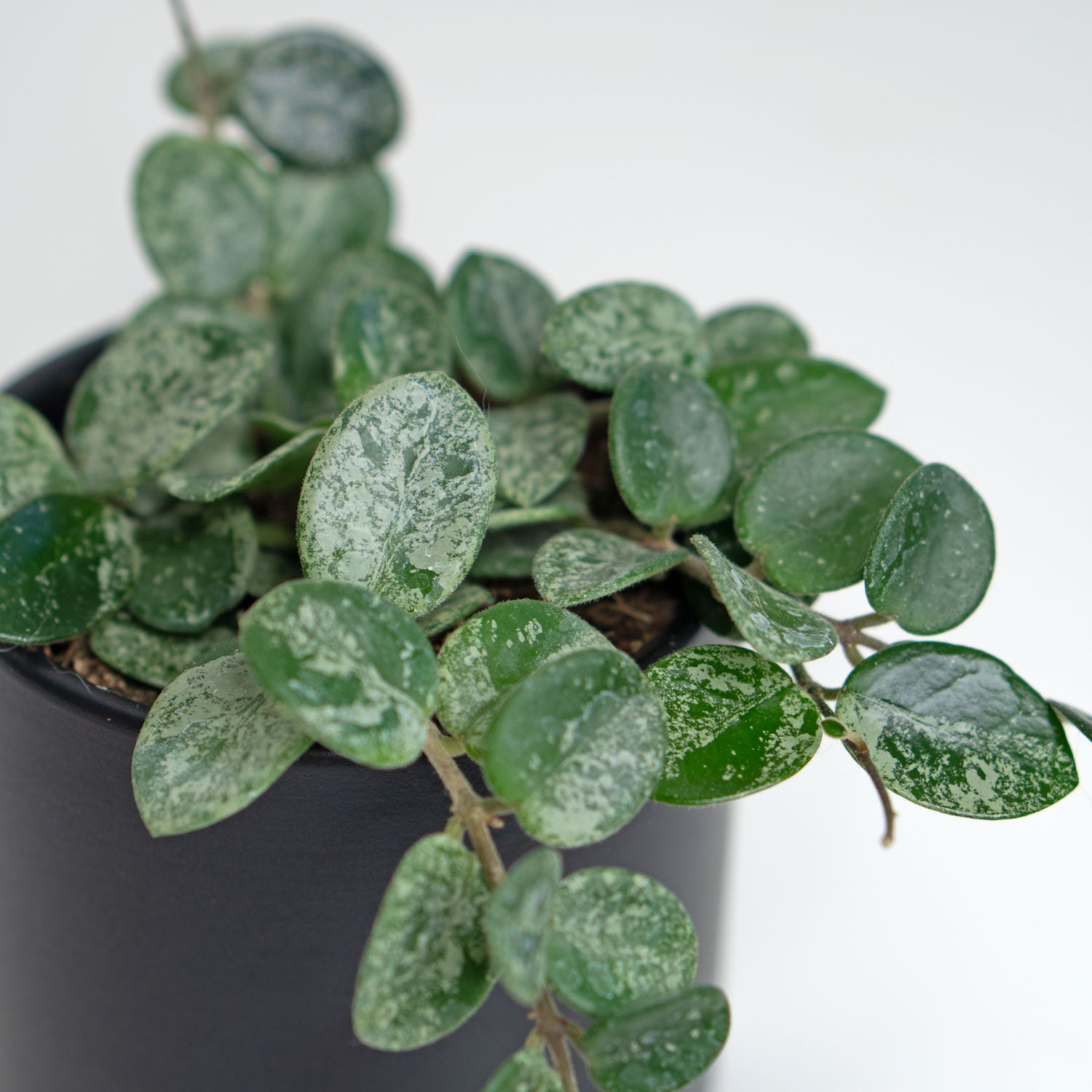 Hoya Mathilde Splash is a graceful houseplant with heart-shaped leaves and shimmering speckles. This compact, trailing beauty adds sophistication and allure to any room, while remaining low-maintenance and occasionally producing fragrant, star-shaped blooms.