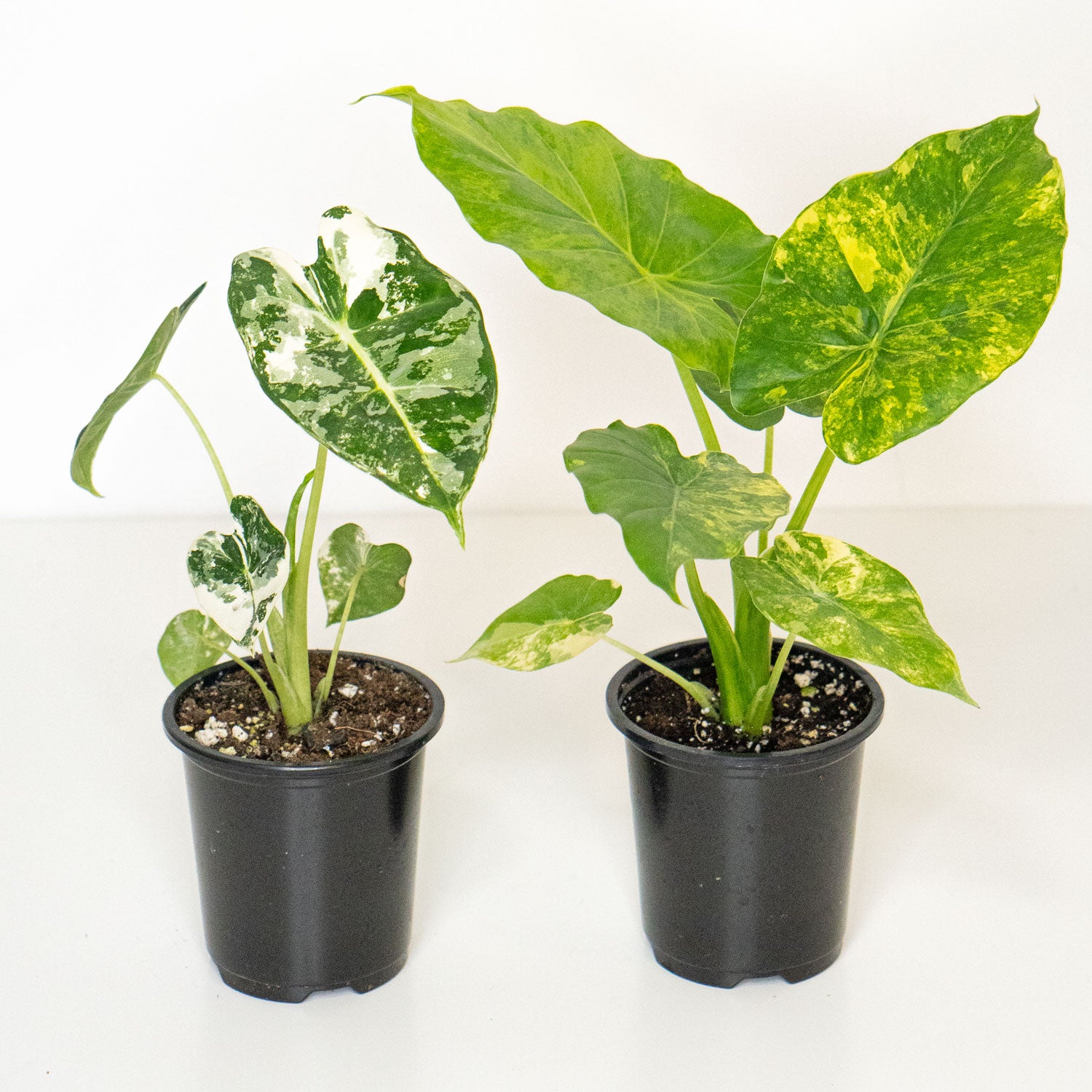 This pack contains two of the most popular variegated Alocasia varieties: Frydek Variegated and Odora Yellow. Notable features of the plants are their individualized leaf shape and hue.