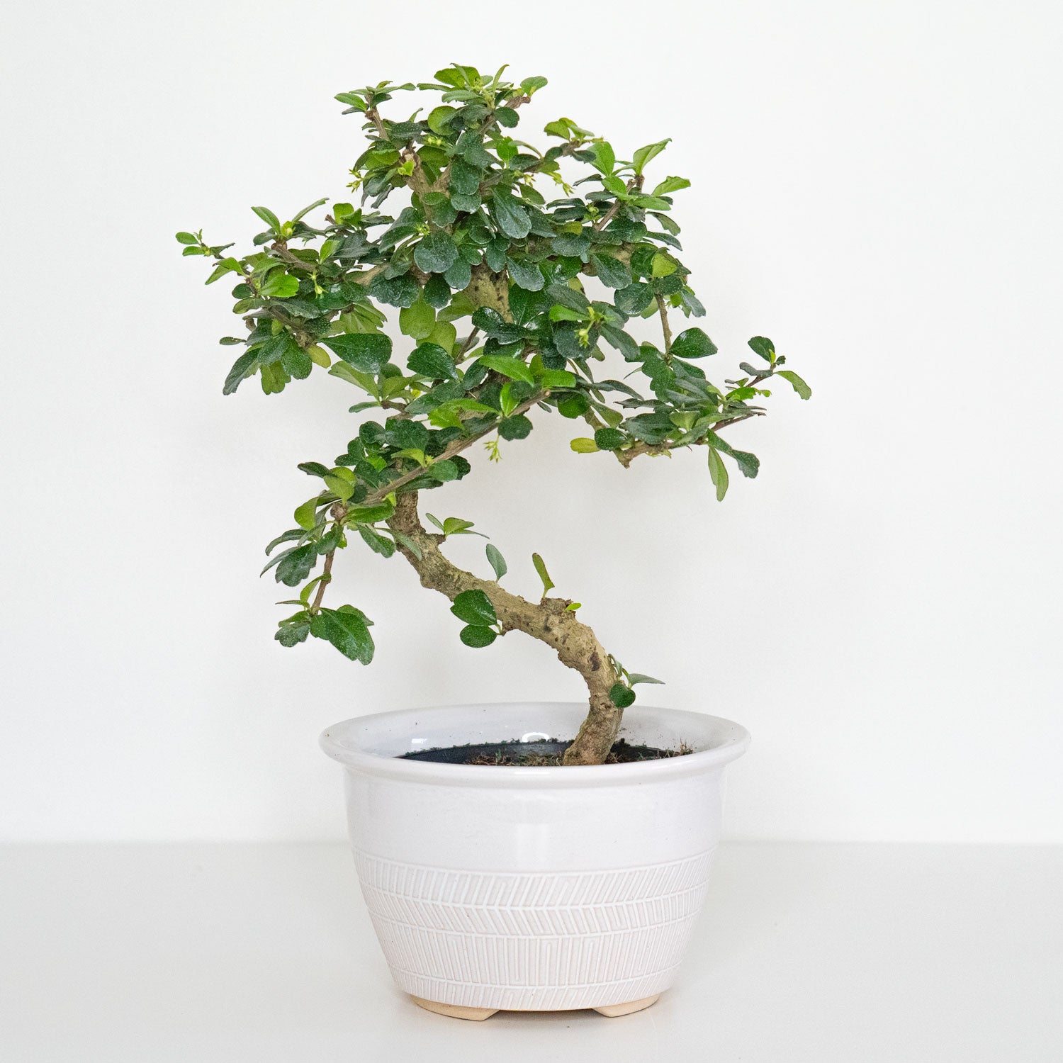 The Bonsai Carmona thrives in bright, indirect light and prefers steady watering with good humidity. Over time, it develops a beautifully textured trunk and may produce tiny white flowers and small berries, adding seasonal charm to its graceful form.