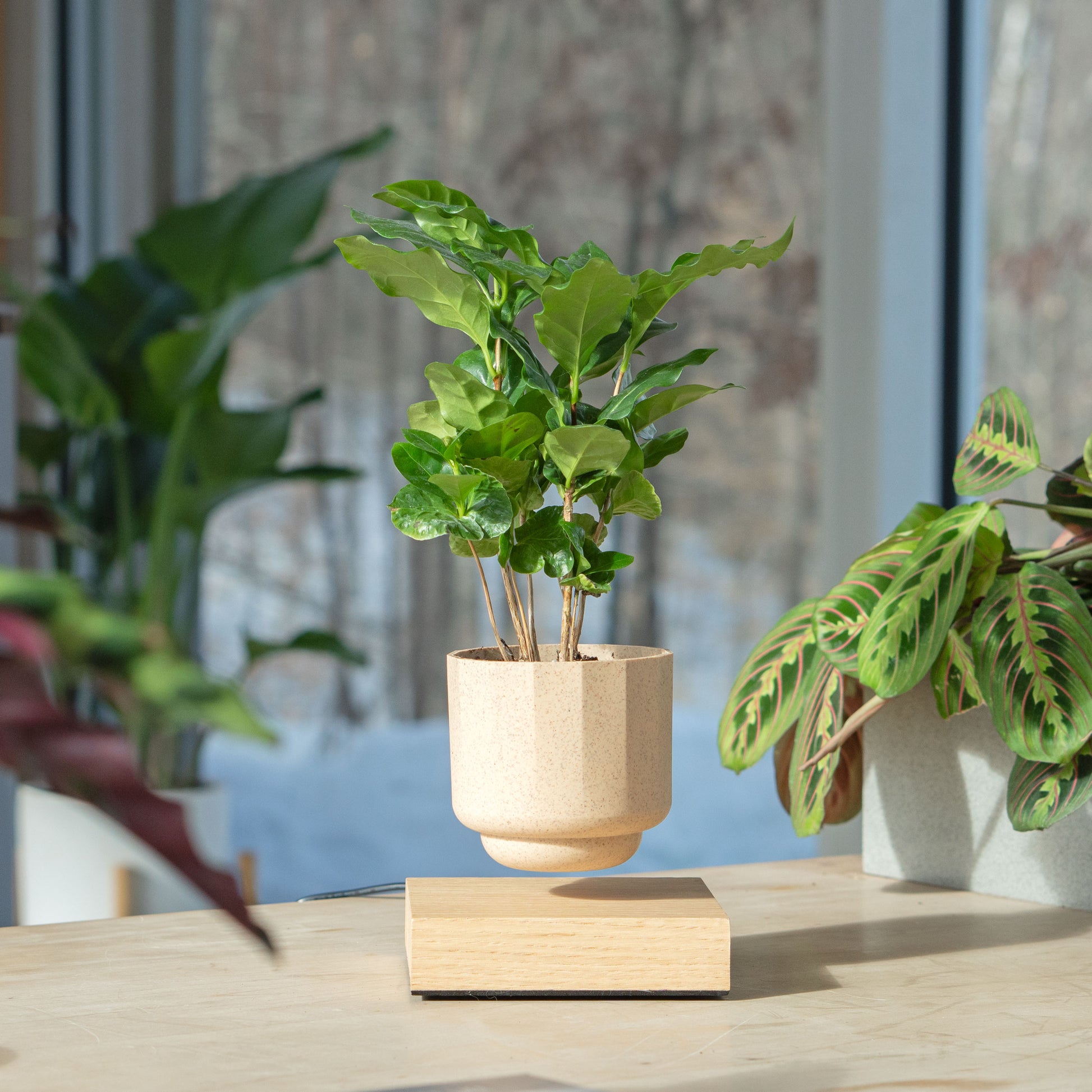 Could you imagine a live plant float in the mid-air and rotate gently? Your Calathea will be nourished with 360 degrees of sunlight exposure, allowing it to grow straighter and healthier, all while floating supernaturally.
